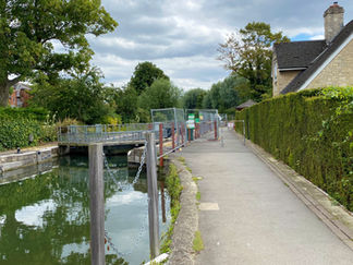 The path continued its rural feel for a while before crossing a metal bridge onto an island at Osney Lock, on which the lock keepers house stood. Another metal bridge connected the island back to the riverside. The path continued in a straight line alongside the river and with terraced houses on one side and industrial buildings on the other, this reminded me a little of Amsterdam and the canals running through the city.